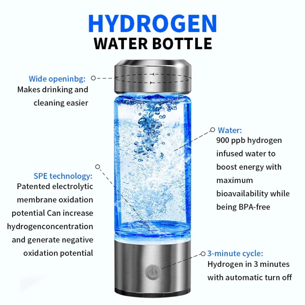 Take your wellness journey on the go with our lightweight hydrogen water bottle. Made from durable borosilicate glass and powered by a USB-rechargeable battery, it delivers hydrogen-rich water in just 3 minutes. With its sleek design and portability, it's perfect for the gym, office, or travel. Hydrate smarter, anywhere.